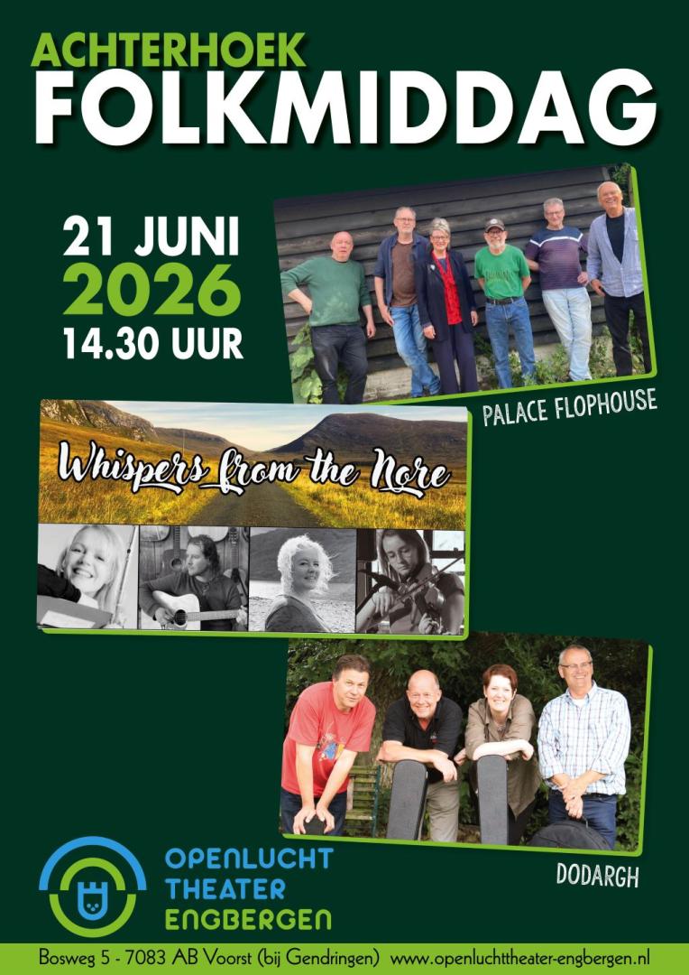 Zondag 21 juni staat het Openluchttheater Engbergen in het teken van folk! Tijdens deze sfeervolle middag geniet je van een rijke mix van Achterhoekse folkrock, Ierse traditie en Keltische invloeden. Met optredens van Palace Flophouse, Whispers from the Nore en Dodargh belooft het een muzikale reis vol passie, energie en samenzang te worden.