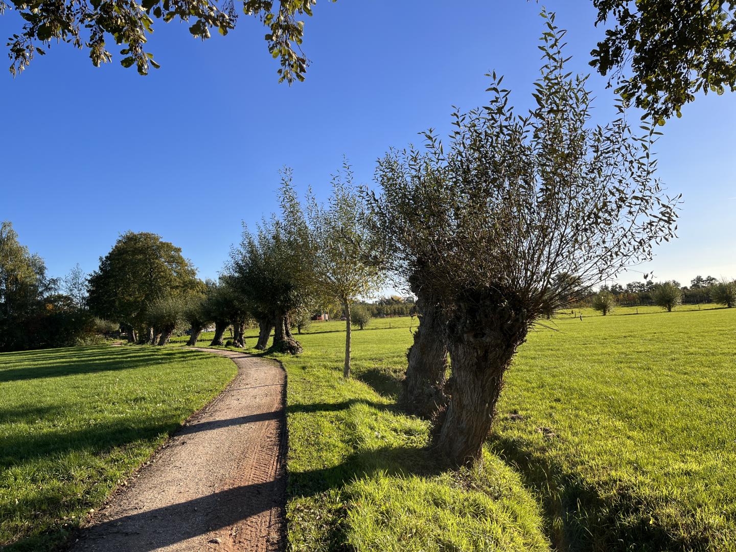 Volg vanaf de parkeerplaats van Résidence Lichtenvoorde de rode voetstapjes over het park. Verlaat het park aan de achterzijde en ga linksaf de Koemaatsdijk op.