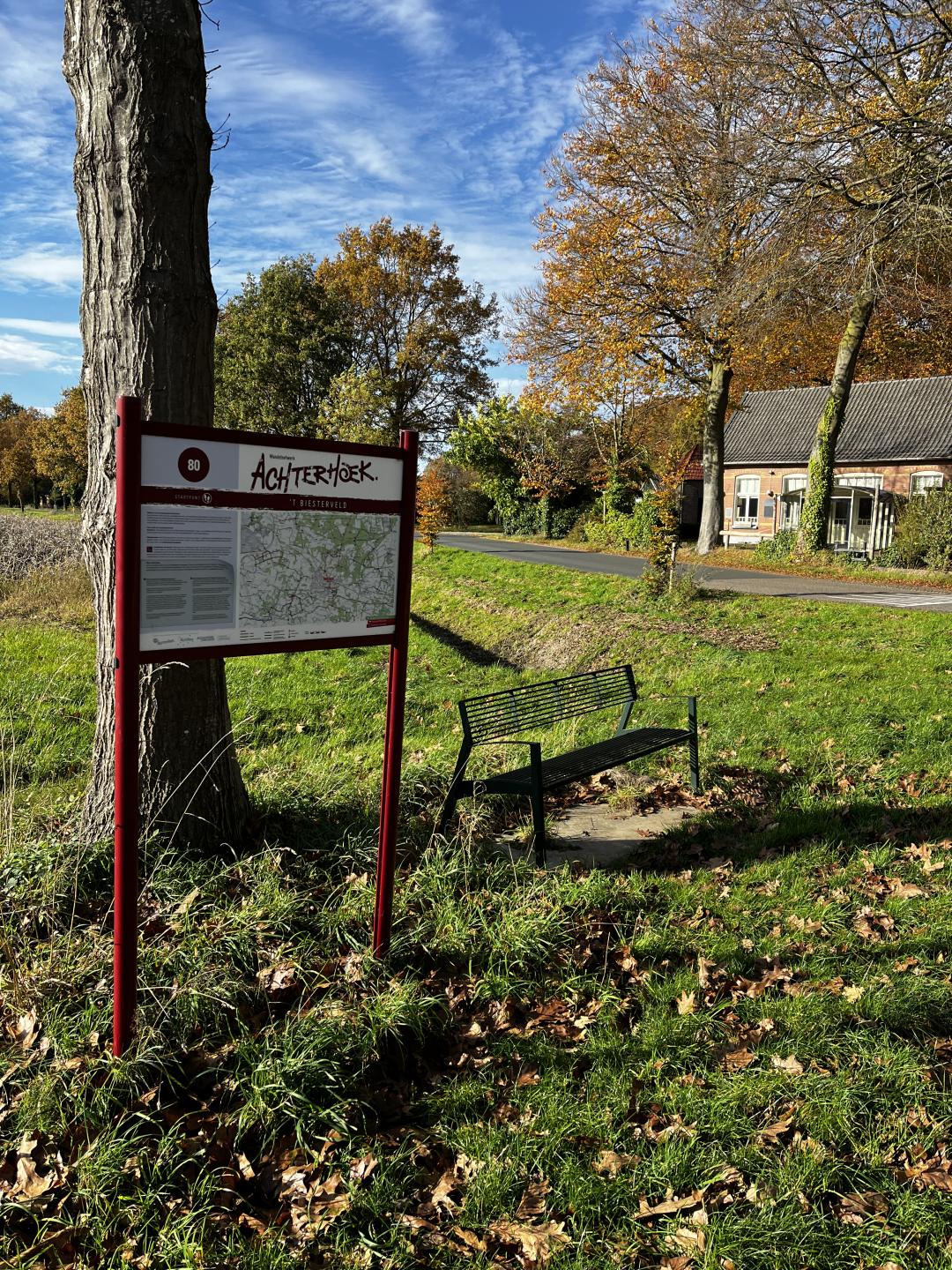 De route is de starten bij 't Biesterveld. Iets verder dan het bord, liggen achter het voormalige restaurantje een aantal parkeerplaatsen. Je volgt de groene voetstapjes/pijlen.