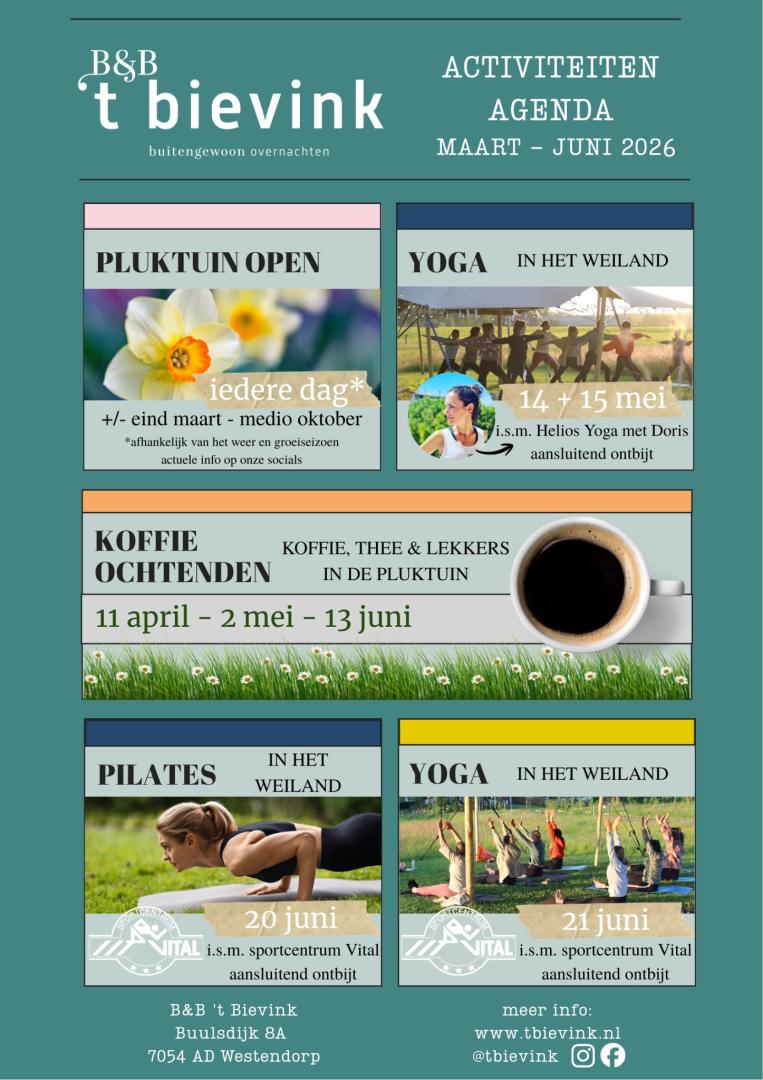 Onze koffiebar staat klaar van 9.30 tot 13.00 uur. De inloop is vrij, we reserveren geen tafeltjes. Betalen kan contant of via een QR code. De pluktuin is de gehele dag geopend. Honden mogen – mits aangelijnd – ook meekomen.