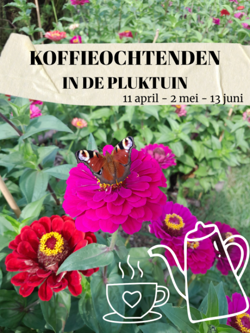 Op zaterdag 11 april, zaterdag 2 mei en zaterdag 13 juni kun je in onze pluktuin genieten van een kop koffie of thee met huisgemaakt lekkers!