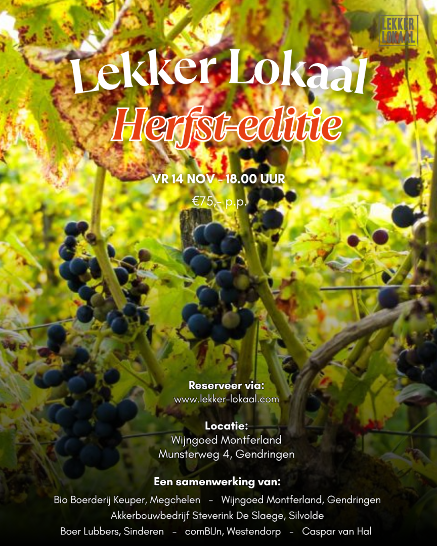 Op vrijdag 14 november ben je van harte welkom voor een bijzonder diner bij Wijngoed Montferland, midden in de Achterhoek. Laat je verrassen door pure smaken, eerlijke streekproducten en een sfeervolle setting. Het diner vindt plaats in het prachtige wijnhuis van Wijngoed Montferland. Reserveer jouw plek bij deze herfst-editie van Lekker Lokaal.