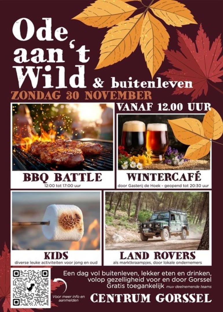 Zondag 30 november staat het centrum van Gorssel in het teken van het wildseizoen en het buitenleven. Diverse lokale ondernemers (winkels en horeca) zorgen voor de nodige 'warme en lekkere' gezelligheid. Van 12.00 tot 17.00 uur zijn er tal van kraampjes en diverse activiteiten voor kinderen. Ode aan ’t Wild beleefde eerder al edities in 2017, 2018 en 2019 en ook dit keer draait het vooral weer om de lokale ‘BBQ-Battle’. Tien lokale (gelegenheids)teams strijden om de eer om hét BBQ-Team te worden van 2025. Elk team krijgt de opdracht om drie culinaire hoogstandjes met wild te verzorgen en te serveren aan de jury. Om 12.00 uur gaan de teams van start met het eerste gerecht en rond 16.30 uur wordt de winnaar bekend gemaakt.