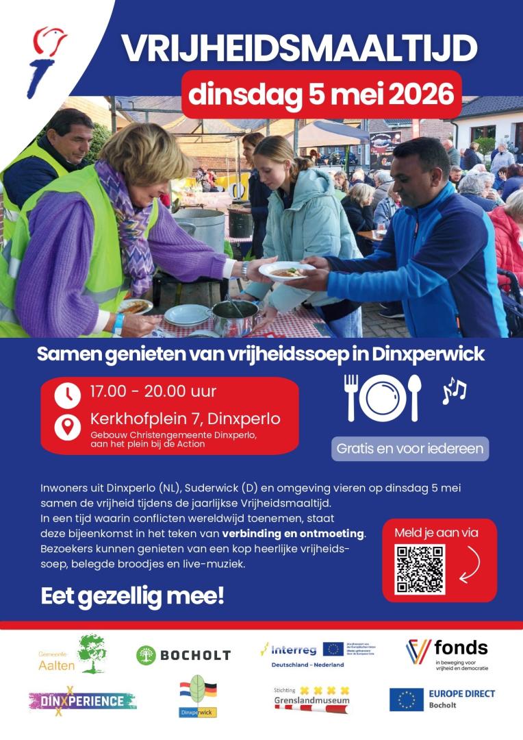 Inwoners uit Dinxperlo (NL), Suderwick (D) en omgeving vieren op dinsdag 5 mei samen de vrijheid tijdens de jaarlijkse Vrijheidsmaaltijd. In een tijd waarin conflicten wereldwijd toenemen, staat deze bijeenkomst in het teken van verbinding en ontmoeting.