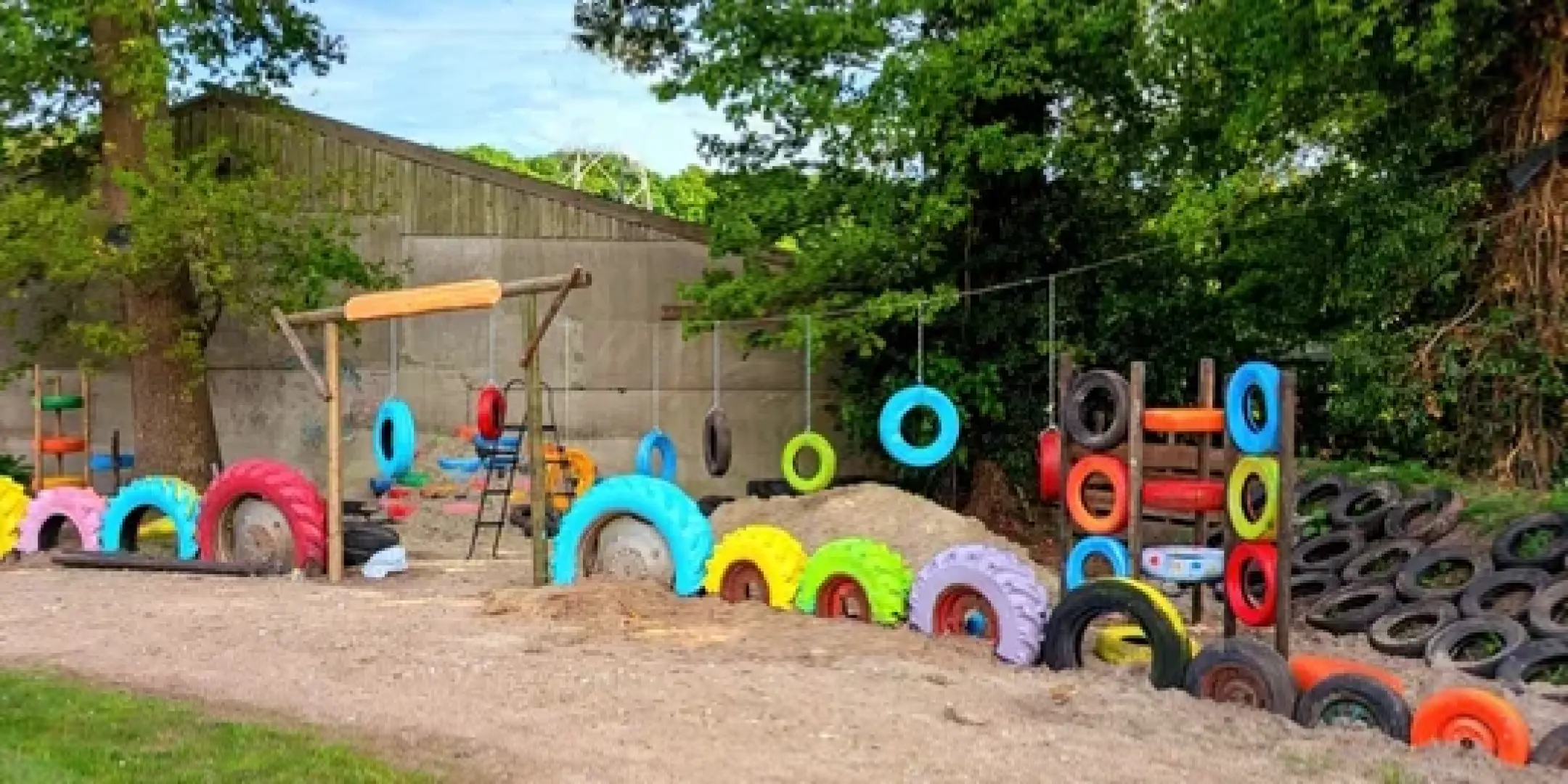 Onder de grote eikenbomen hebben we een geweldig stoere banden speeltuin gemaakt voor de allerkleinste kinderen. Zo is het in de zomer heerlijk spelen in de schaduw.