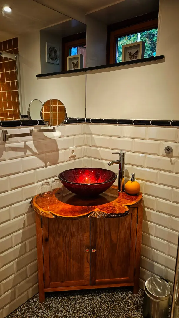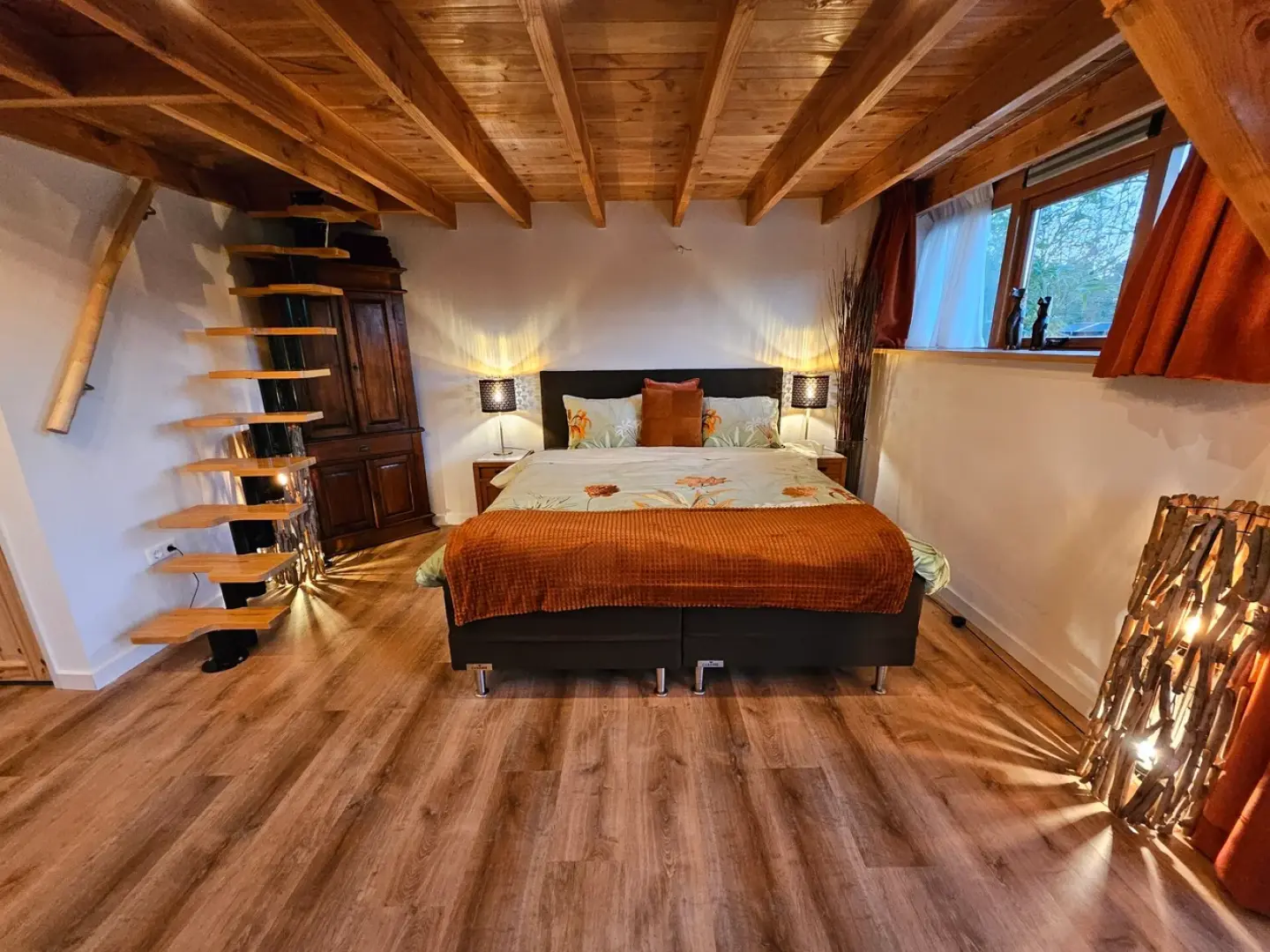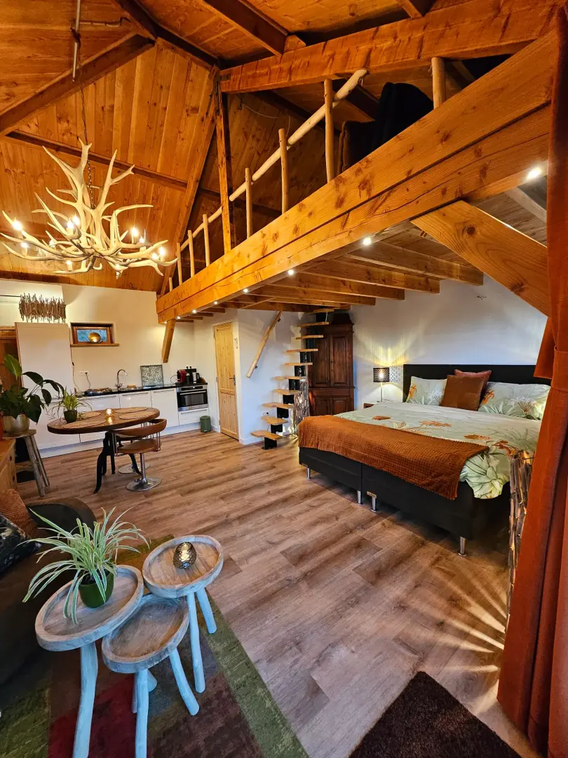 Stap binnen in een warm, stijlvol verblijf waar de natuur je omarmt. De indrukwekkende geweilamp in de woonkamer brengt je direct in een bosrijke, landelijke sfeer. De ruimte ademt warmte en karakter dankzij het overvloedige gebruik van hout en de zorgvuldige afwerking.