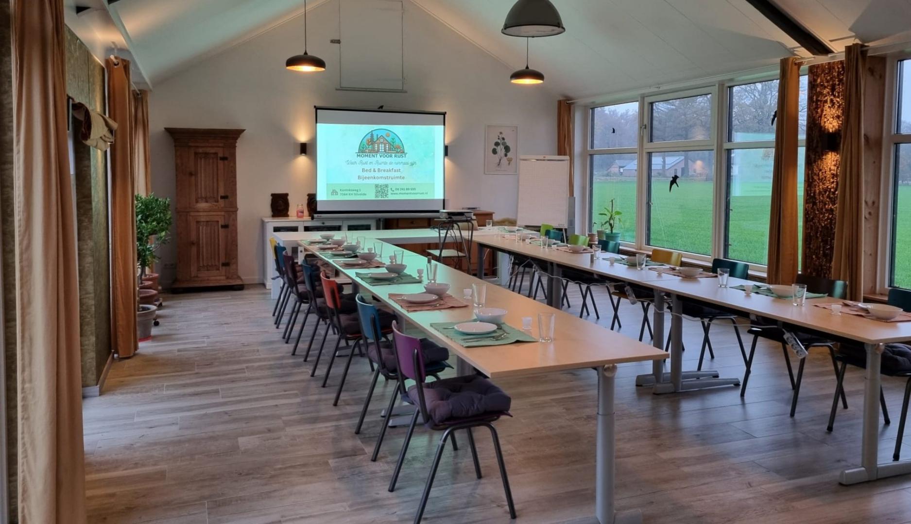 Onze locatie biedt een inspirerende en comfortabele plek voor uiteenlopende activiteiten. Tussen de twee gastenverblijven ligt een ruime ontvangstruimte met een moderne, volledig uitgeruste keuken en een eettafel voor zes personen. Aangrenzend vind je een lichte, open zaal met grote ramen aan beide zijden, waardoor je een prachtig uitzicht hebt over de uitgestrekte Achterhoekse weilanden.
