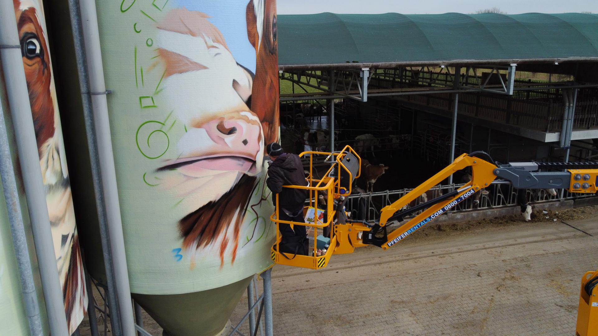 “Ik begin vaak met wat kriebels en krabbels, waaruit een schets ontstaat. Deze schets vul ik vervolgens met sprayverf: dit werkt het snelst en het droogt enorm snel. Ik maak het liefst realistische werken en gebruik daarom graag waarheidsgetrouwe kleuren. Maar ik geef er wel graag een twist aan, een soort van artistiek tintje. Zo heb ik in het ontwerp op de schuurdeur er bewust voor gekozen om slechts een deel van de koeienkop weer te geven. De uitsnede – van oor tot mond – is beperkt maar het beest blijft wel herkenbaar. Het maakt het juist extra krachtig. Het is net alsof deze koe je recht aankijkt.”