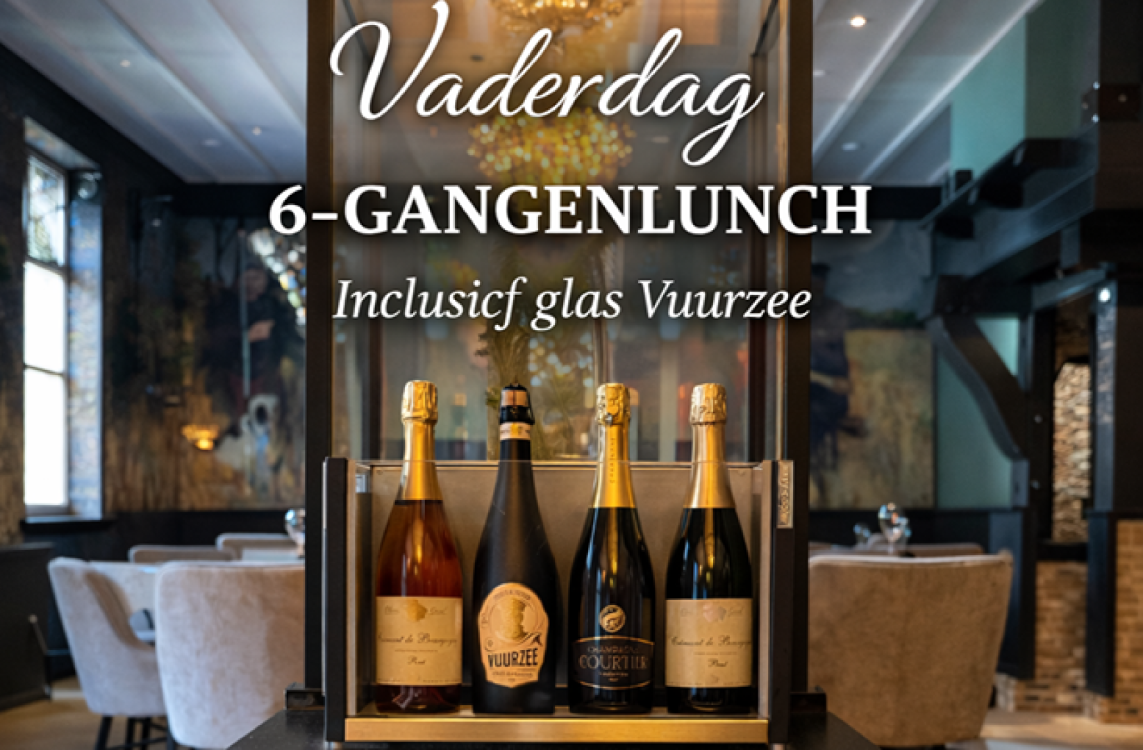 Wij serveren een zesgangenlunch waarin het seizoen centraal staat, met verfijnde gerechten en aandacht voor detail, zoals u van ons gewend bent. Bij aankomst ontvangen wij u met een glas Vuurzee.